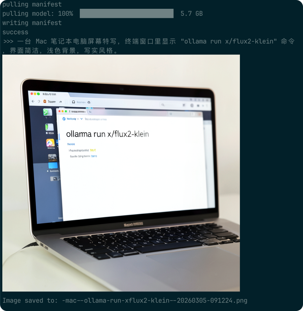 Klein 已上架 Ollama,装好 Ollama 后通过命令行生图。与对话模型不同:生图仅支持命令行,在 ollama run x/flux2-klein "提示词" 中写入提示词、回车即出图,无交互式对话窗口。