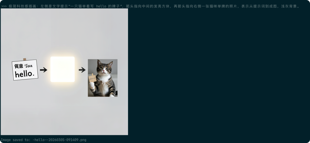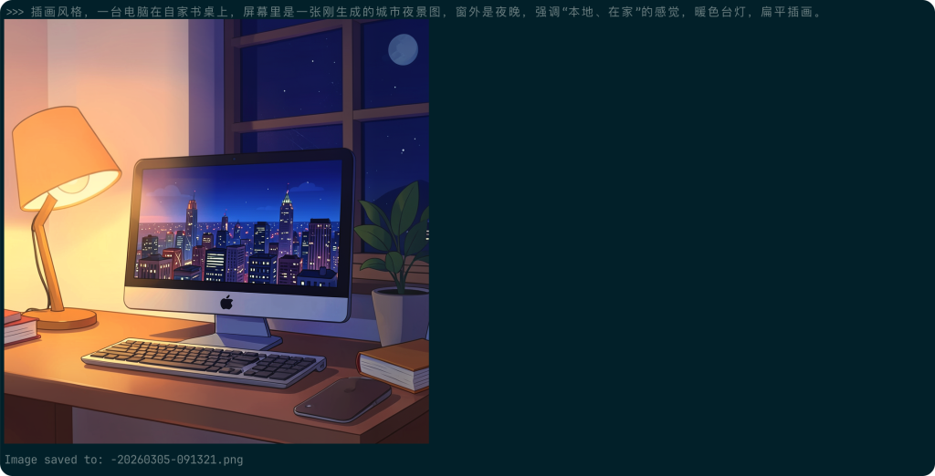 首次运行会拉取 4B 模型(约 5.7GB),完成后按提示词生成并保存图片。每次执行一条命令生成一张图,无交互窗口;需多张则多次执行、更换提示词。默认即 4B。